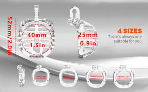 [Complete with matching accessories and available in multiple ring sizes.]: The set comes complete with a metal lock, a plastic lock, three disposable locks, a catheter, an adjustable waist belt for secure fitting, and four different-sized rings ranging from 1.7 to 2 inches to meet various wearing needs.
