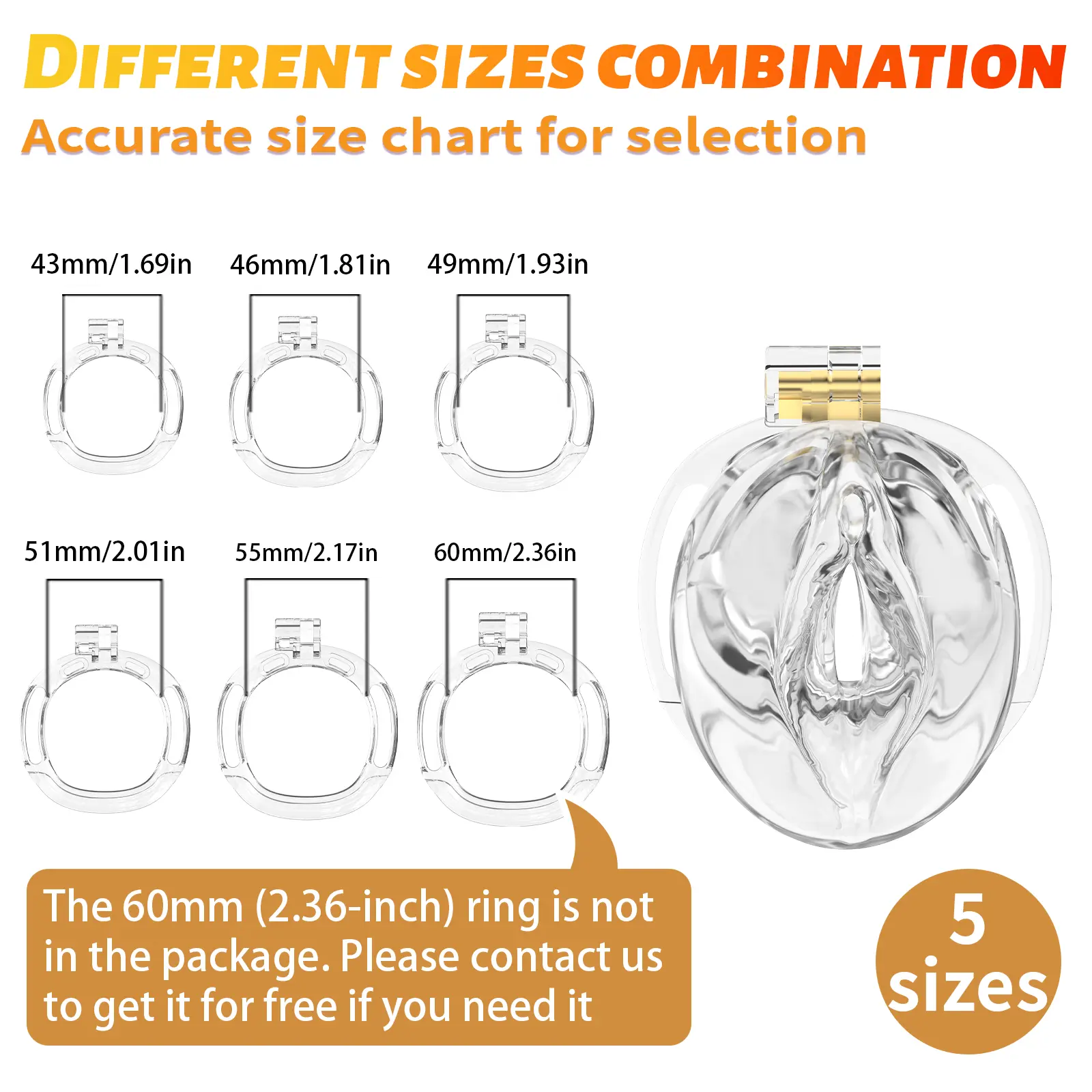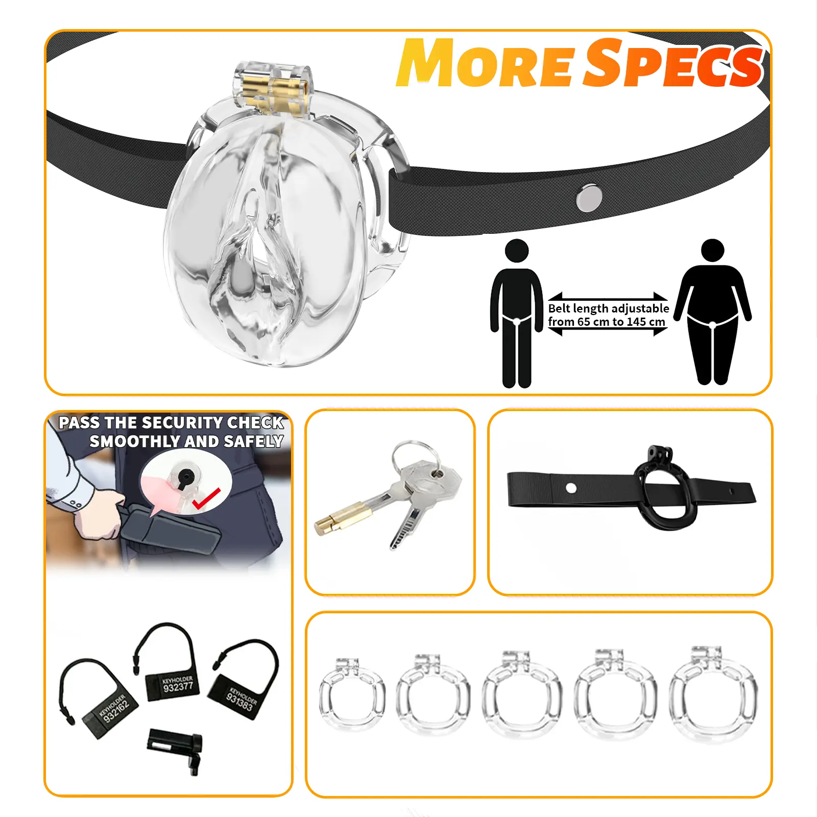 The cage is lightweight and comfortable, with an overall design that is very thoughtful. Its surface is smooth and the texture is very sturdy and durable. Moreover, the various sizes of the rings included make it easy for you to find the most suitable size. It is very concealed beneath the clothes, fixed very firmly, and will not cause any discomfort to you.
