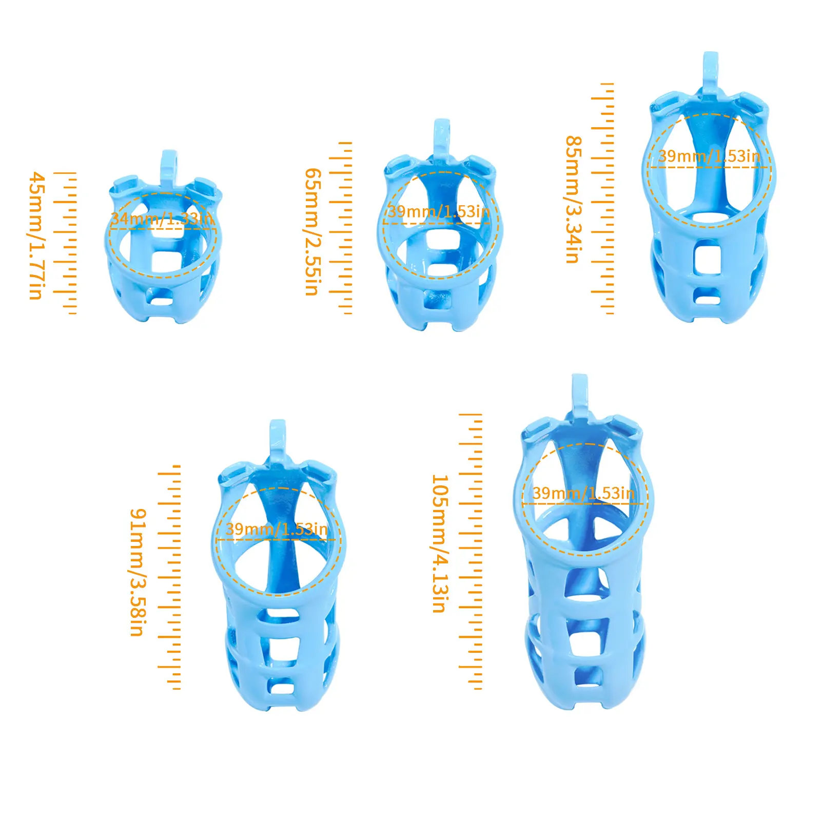 【5 Size Rings】:This chastity cage comes with six different sized rings. It ensures everyone can find their perfect fit, from petite slaves to robust studs.