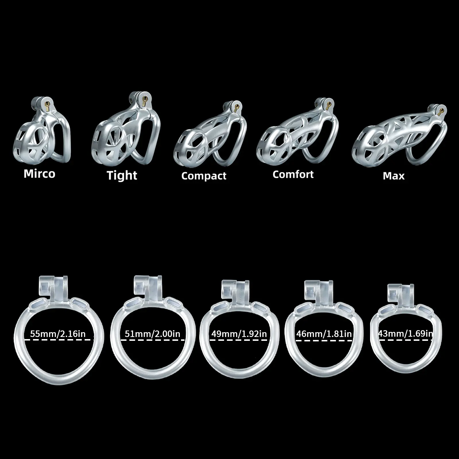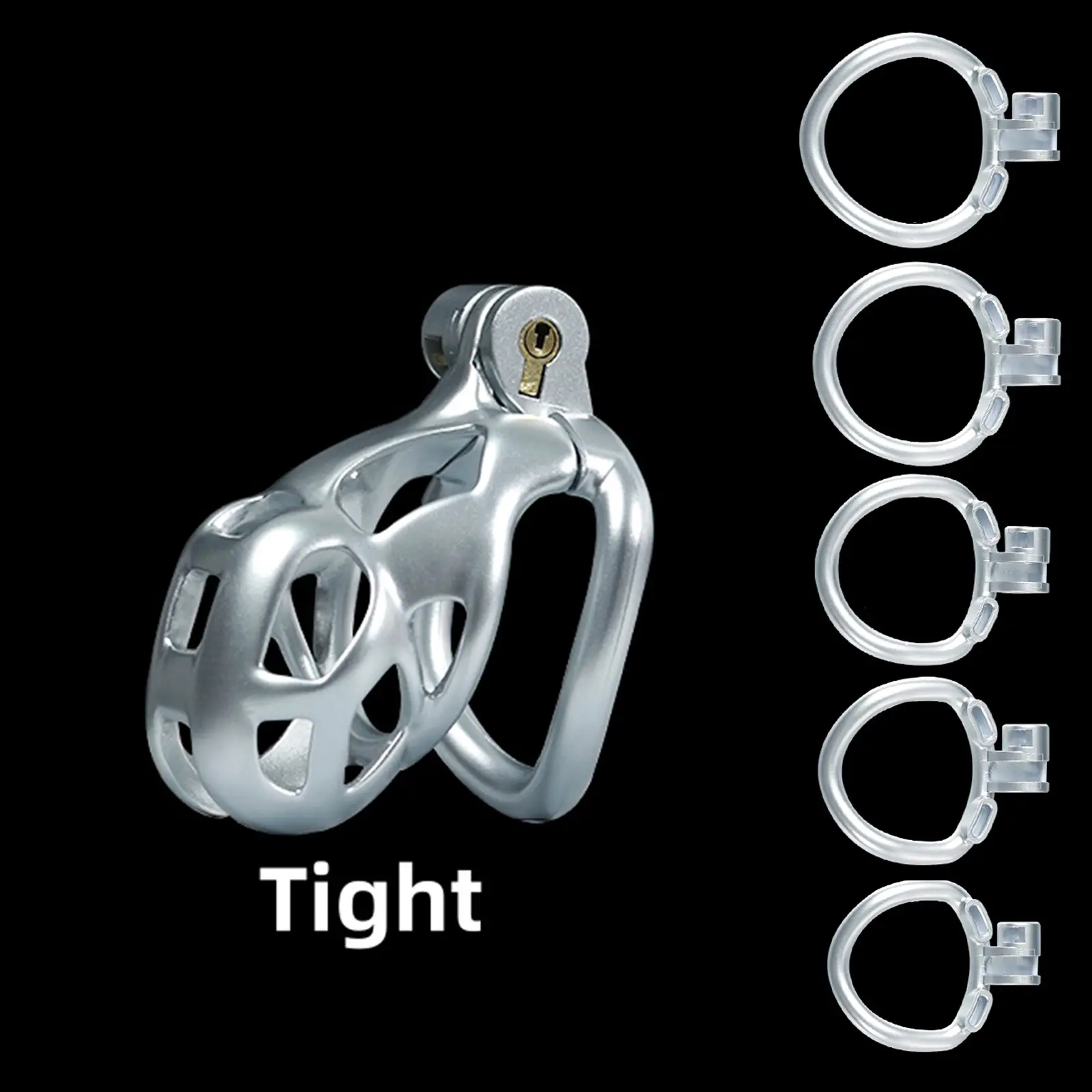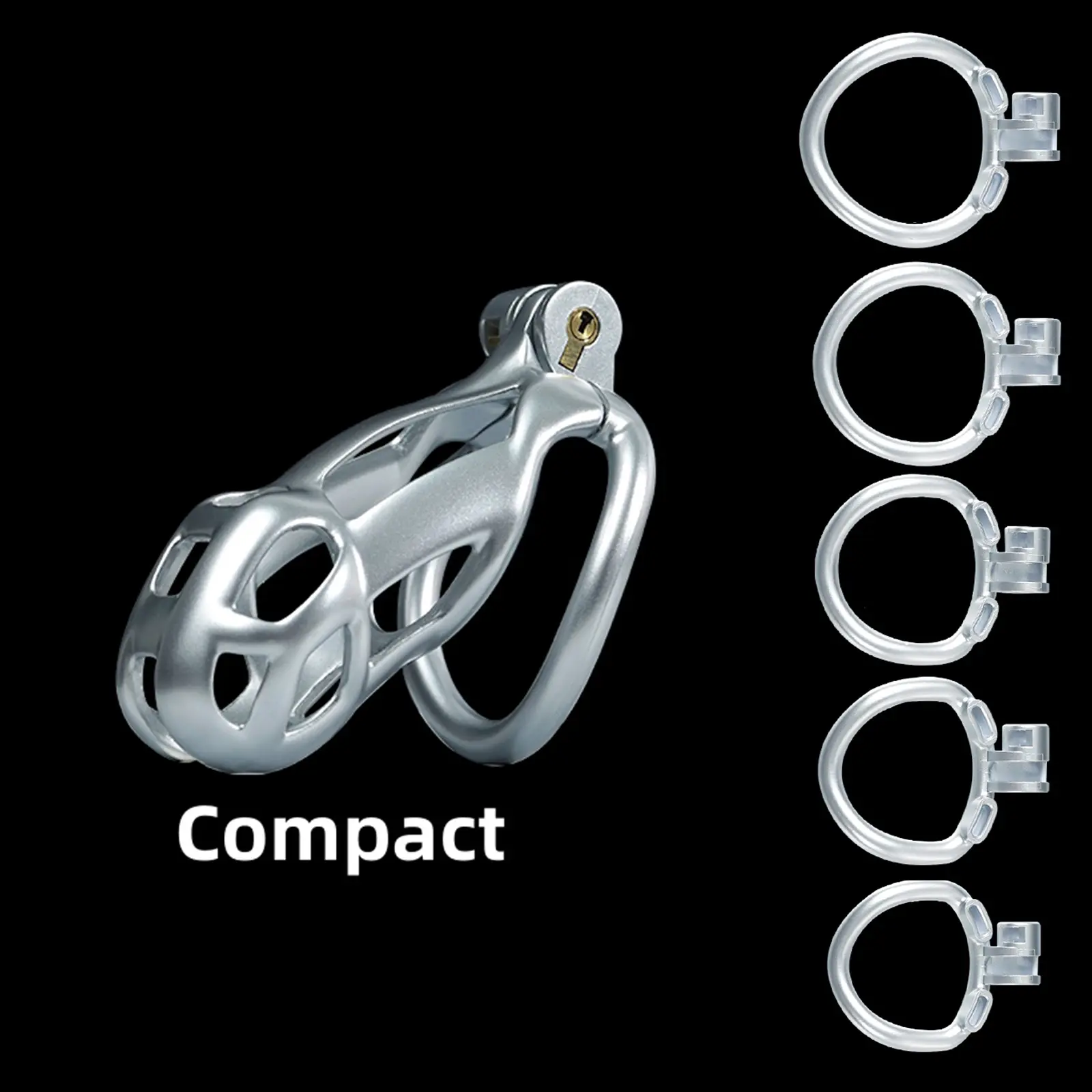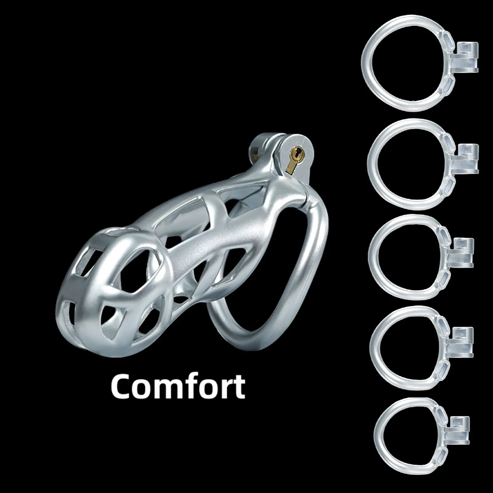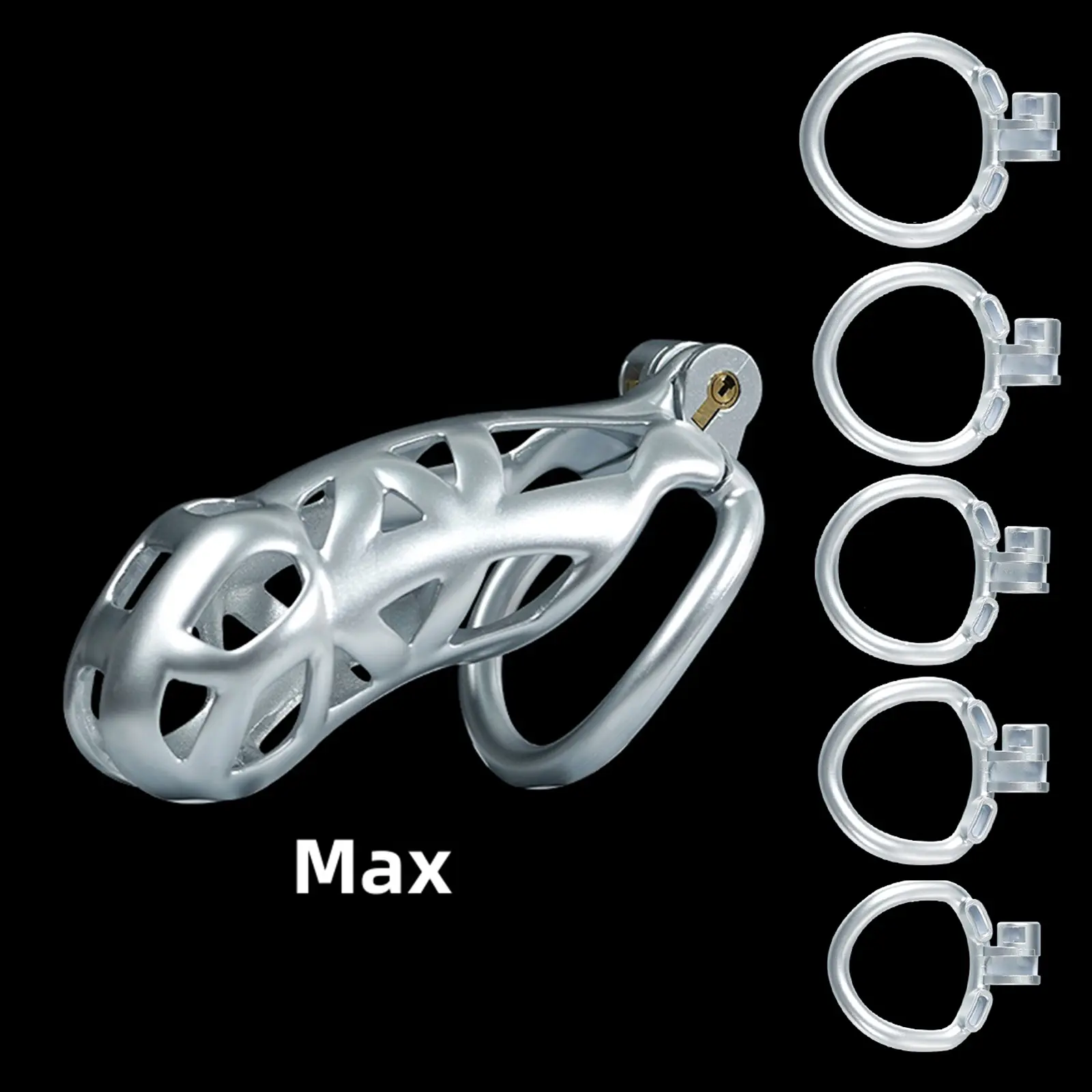 【5 Size Rings】:This chastity cage comes with six different sized rings. It ensures everyone can find their perfect fit, from petite slaves to robust studs.
