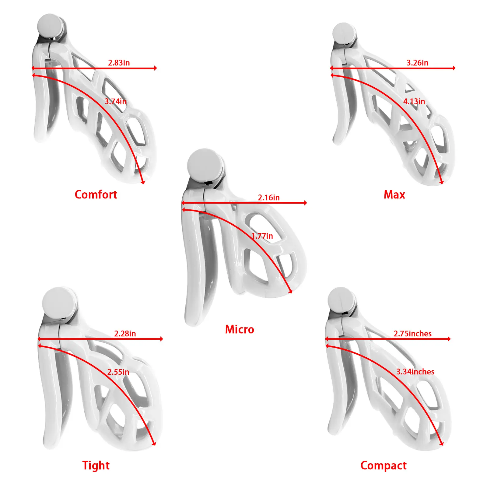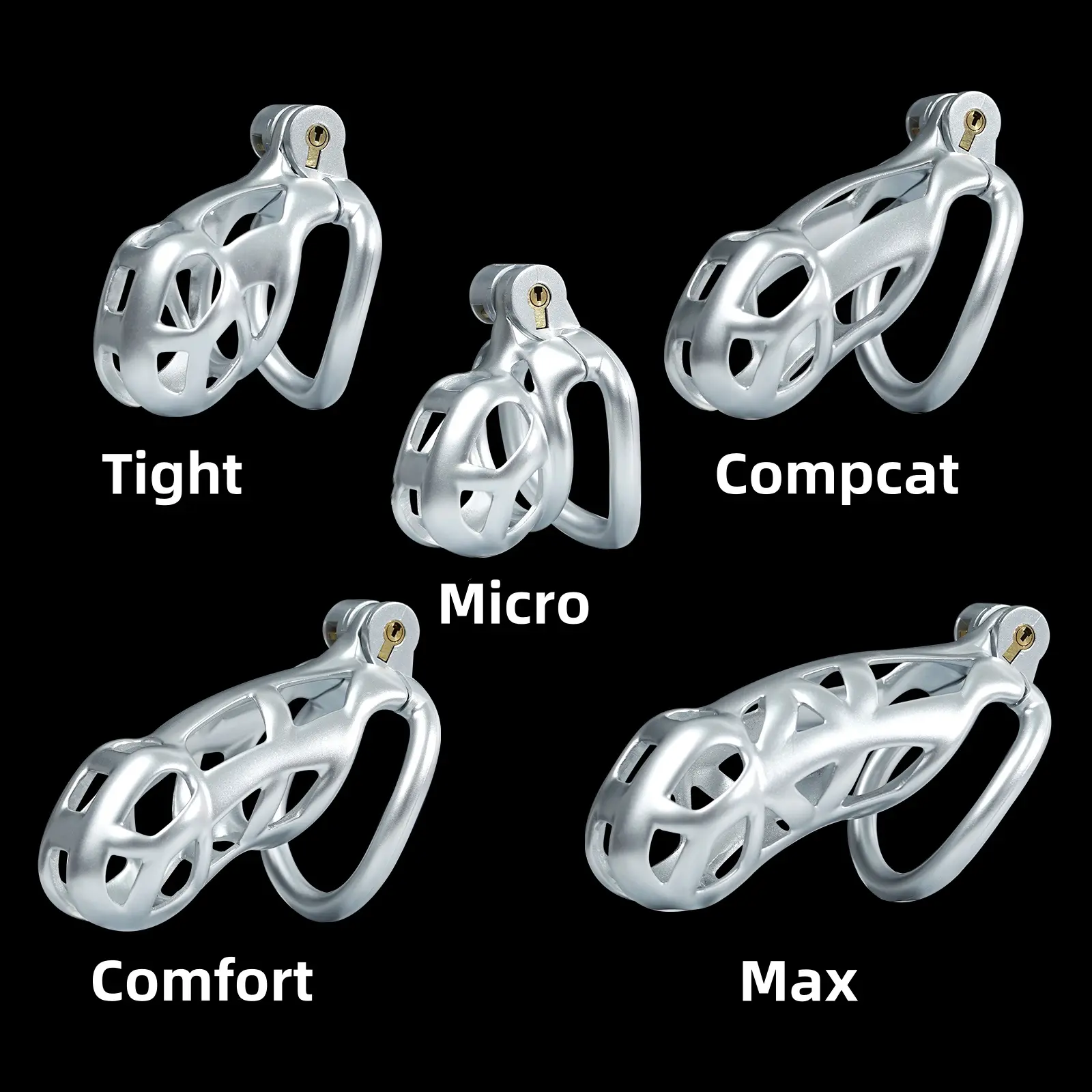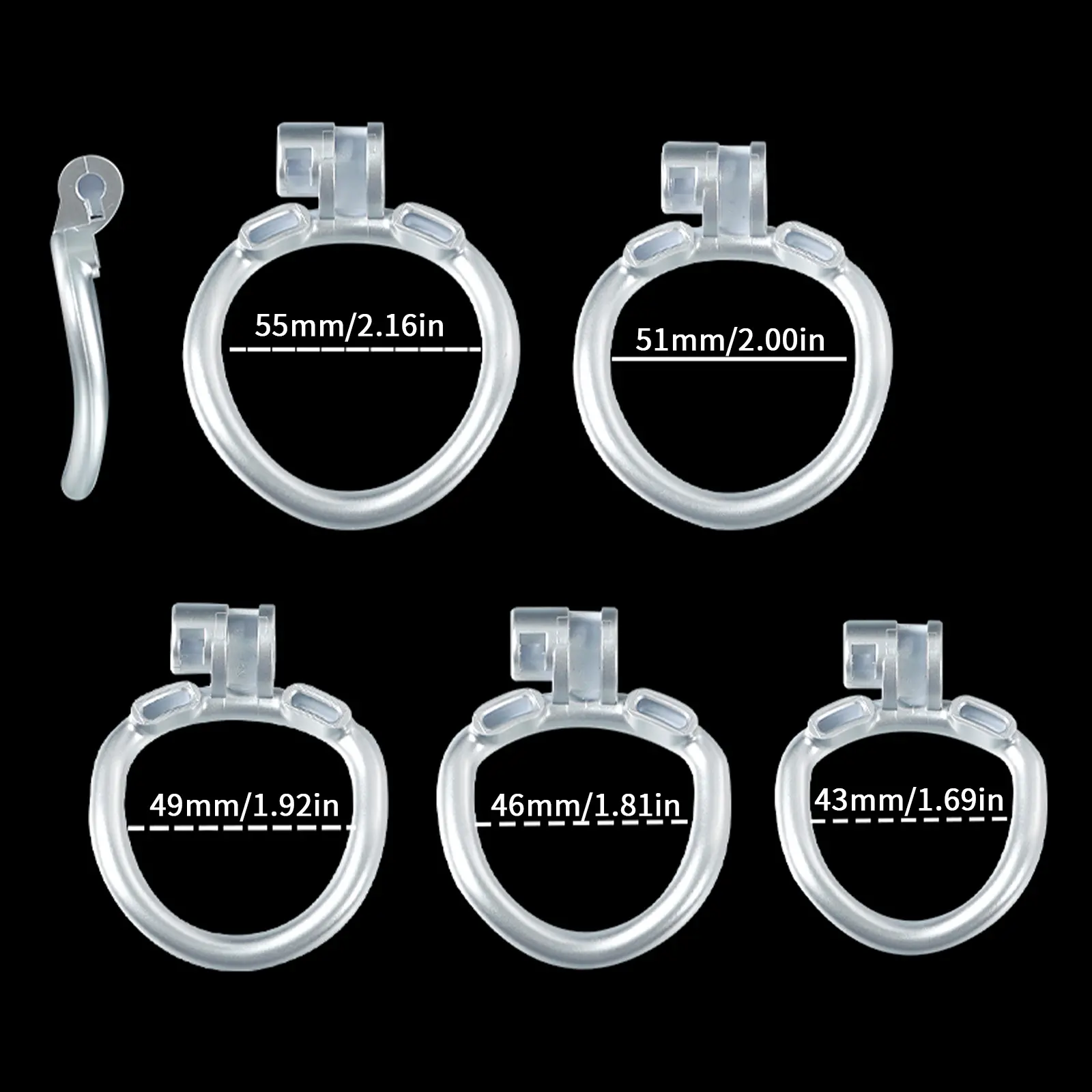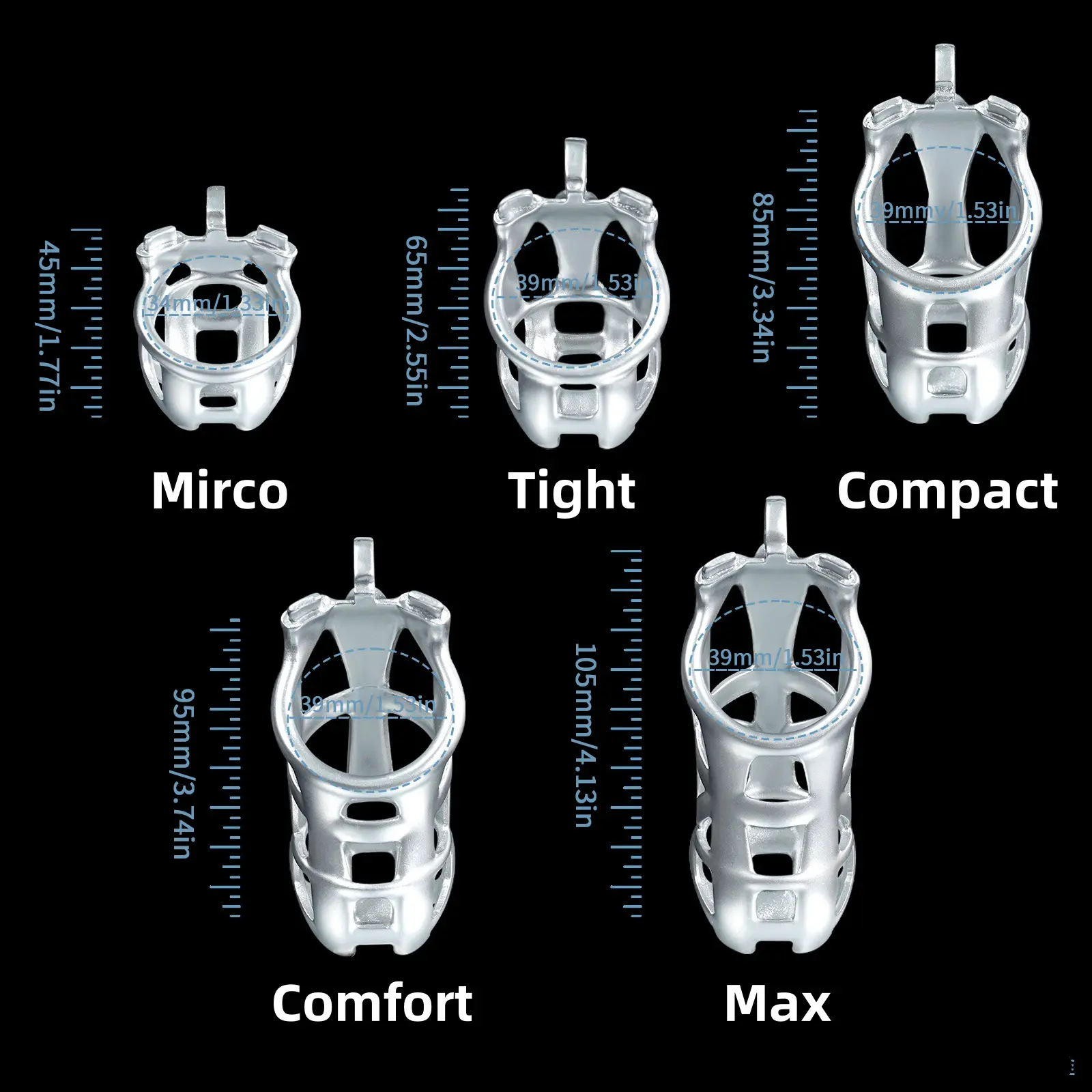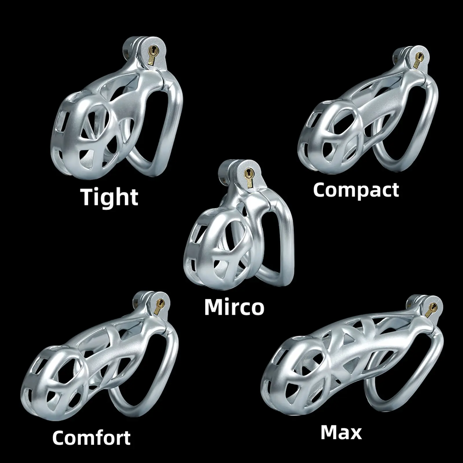 【5 Size Rings】:This chastity cage comes with six different sized rings. It ensures everyone can find their perfect fit, from petite slaves to robust studs.